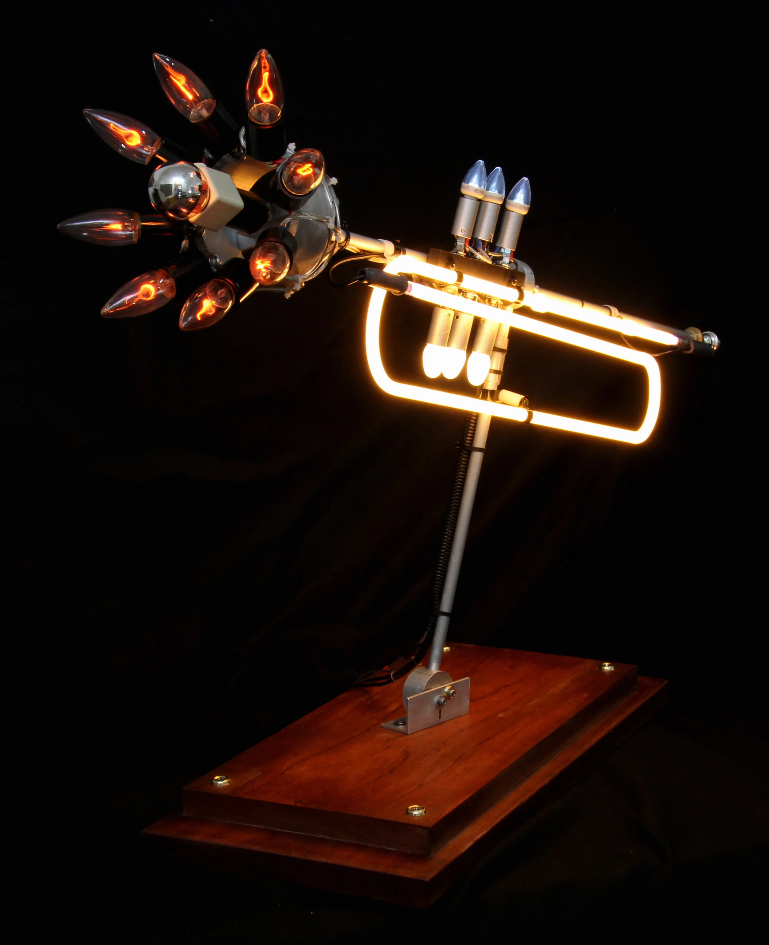 Aluminum, Neon, Various Light Bulbs, Electrical Components, and Mahogany Base.